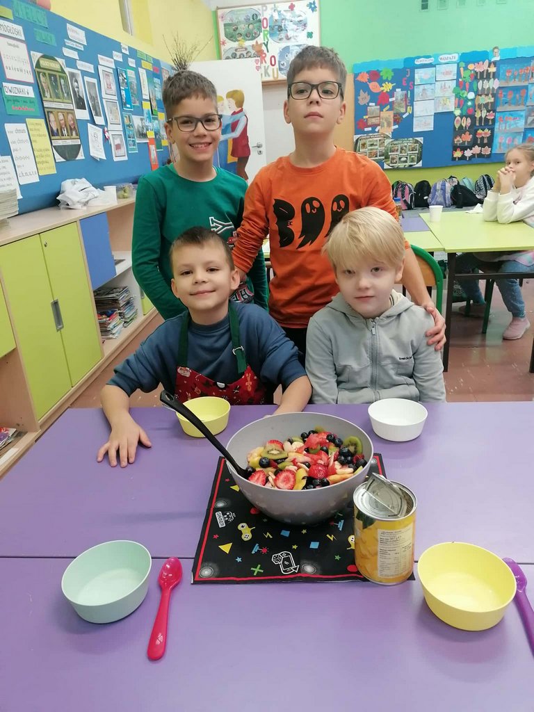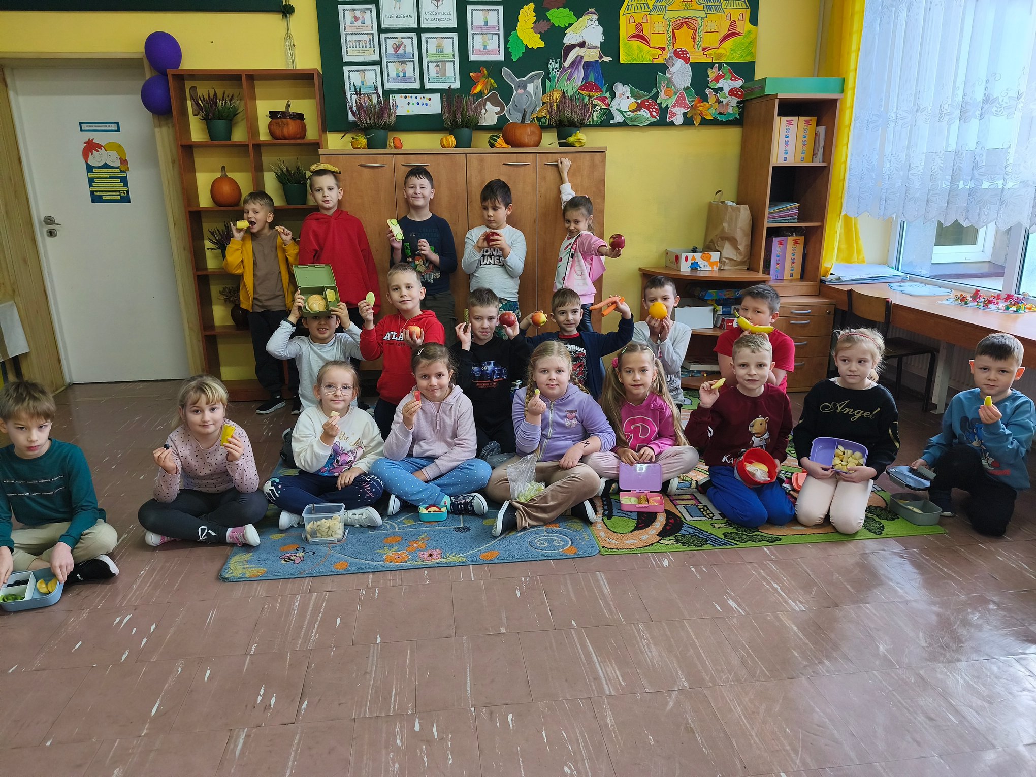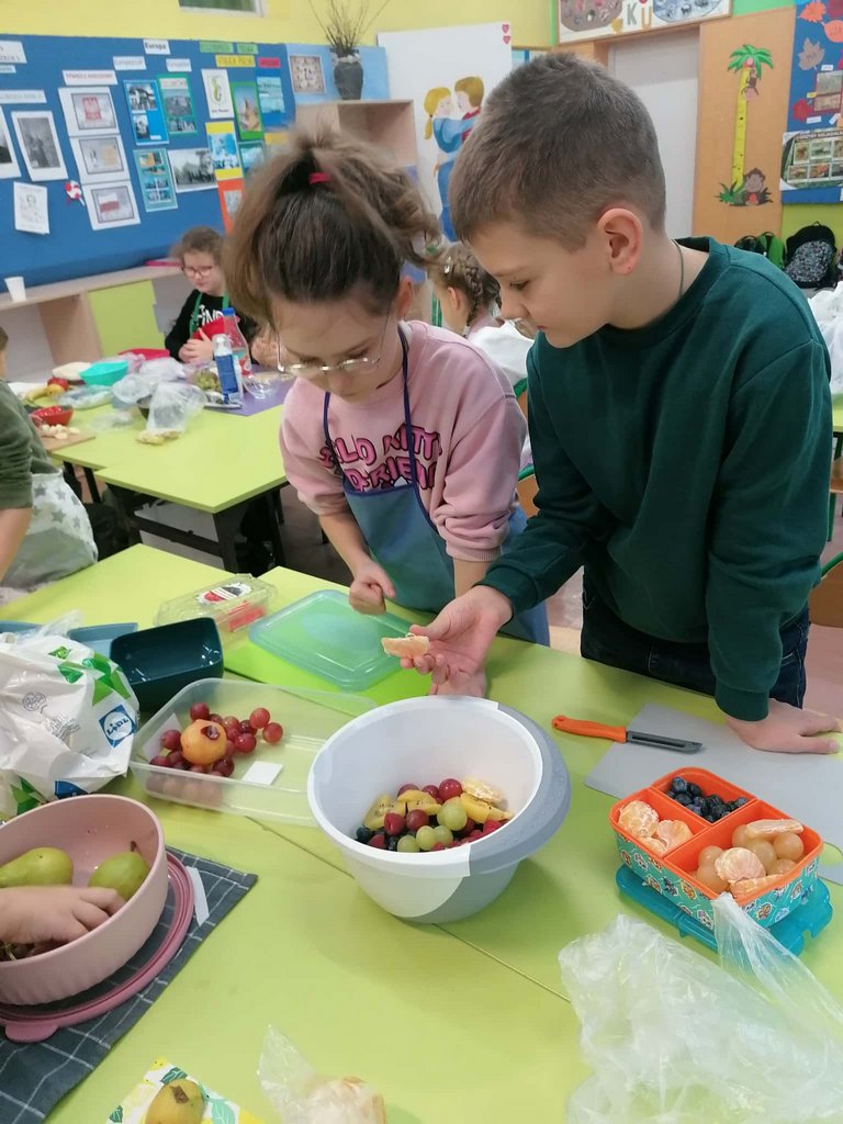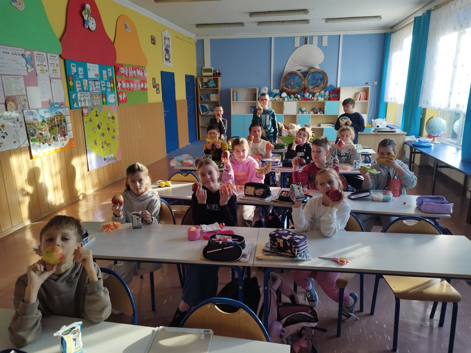 Dnia 19 listopada w naszej szkole odbyła się akcja pt. ,,Owocowa przerwa śniadaniowa’’. Tego dnia każdy uczeń Bajkolandii w swoim pudełku z drugim śniadaniem znalazł ulubiony owoc lub warzywo, które zjadł ze smakiem. W niektórych klasach z pomocą pań wychowawczyń i zaangażowanych rodziców zostały wykonane sałatki owocowe i soki.