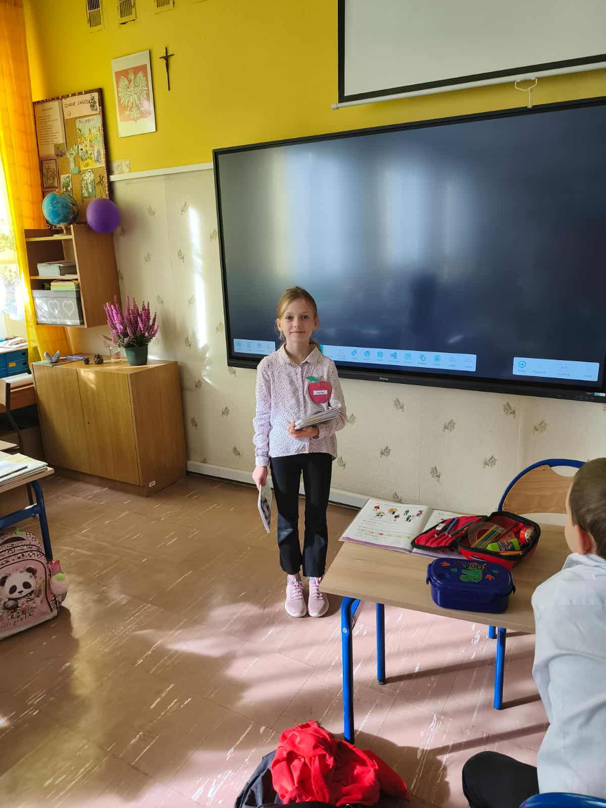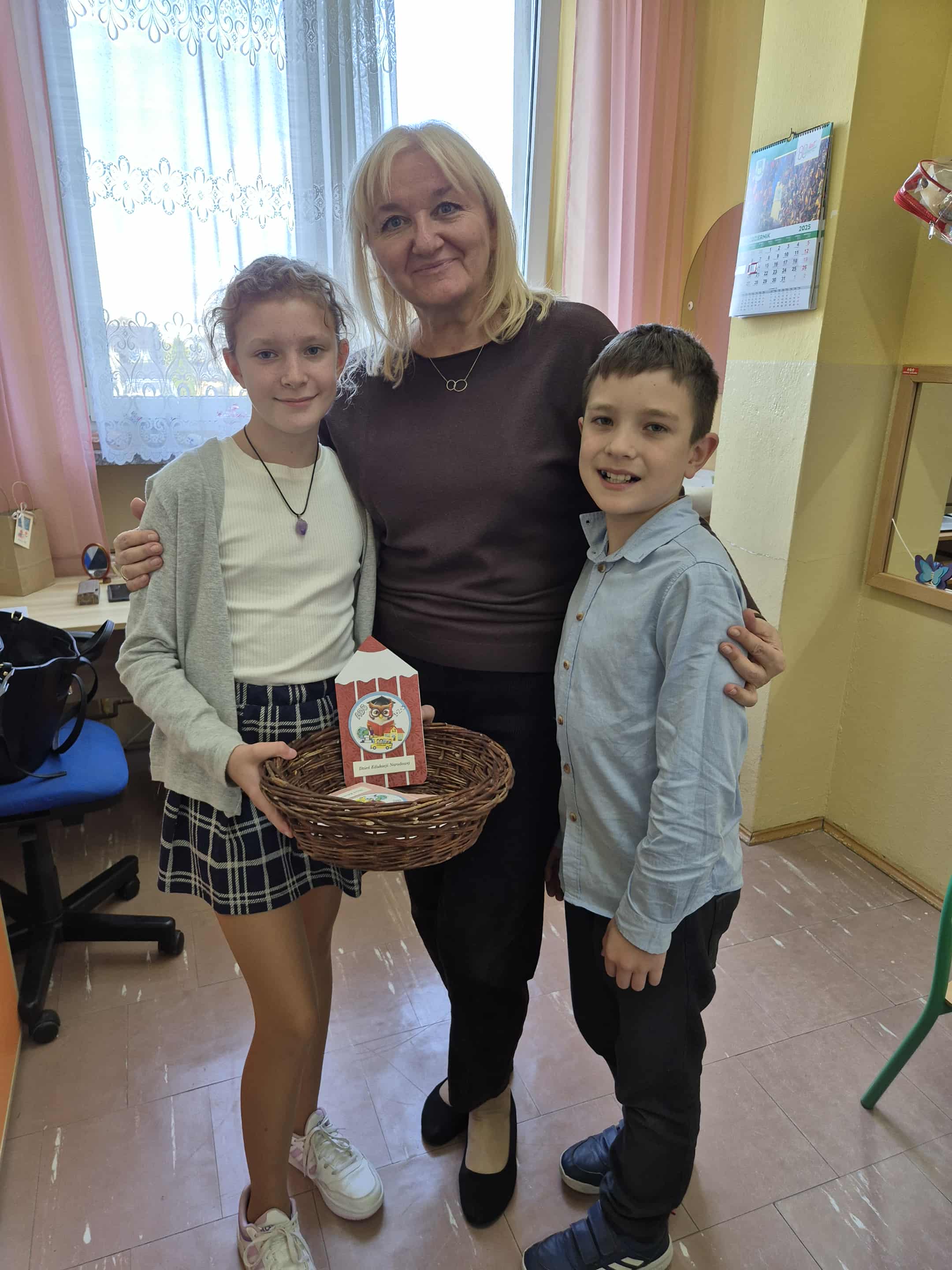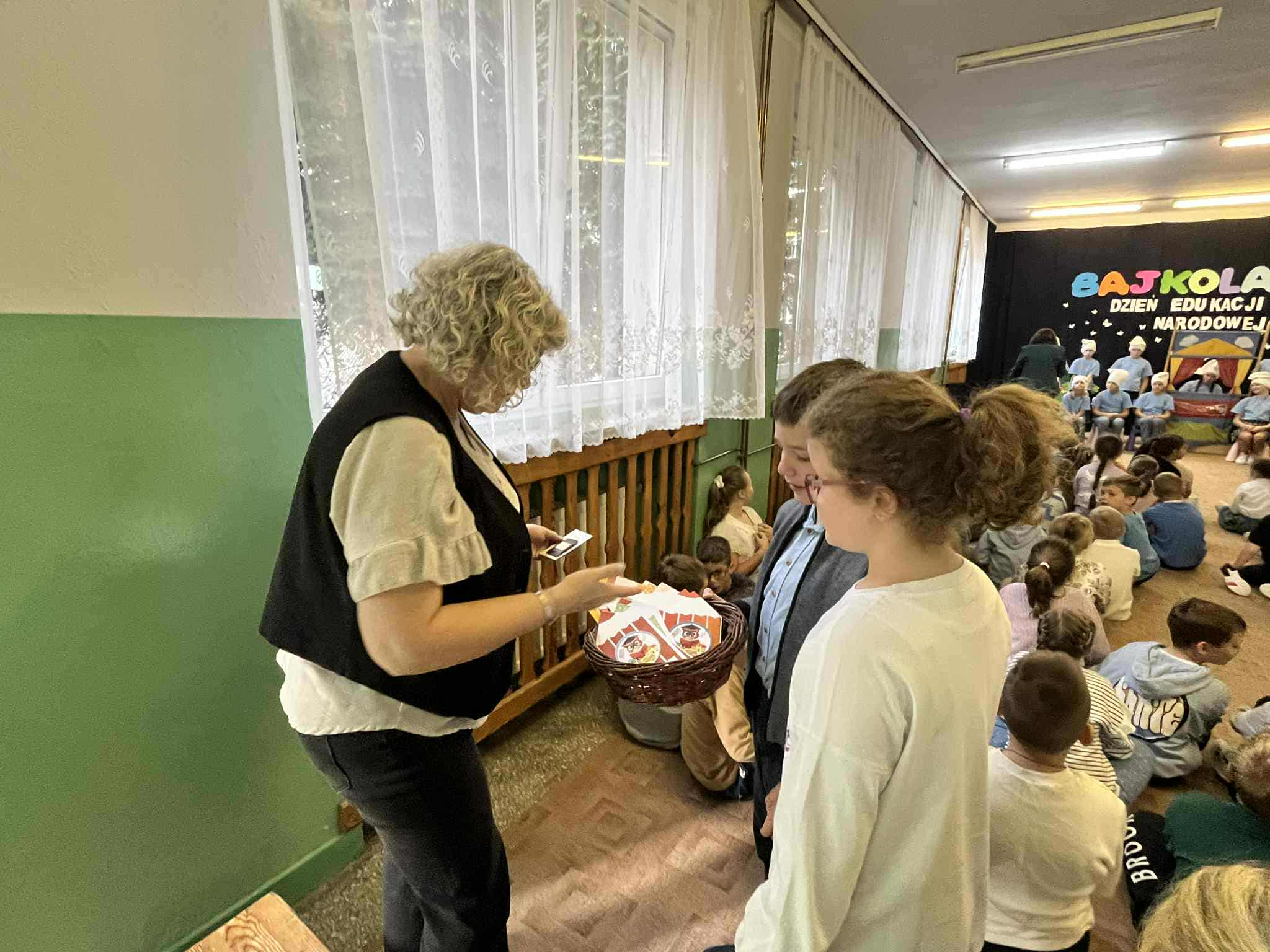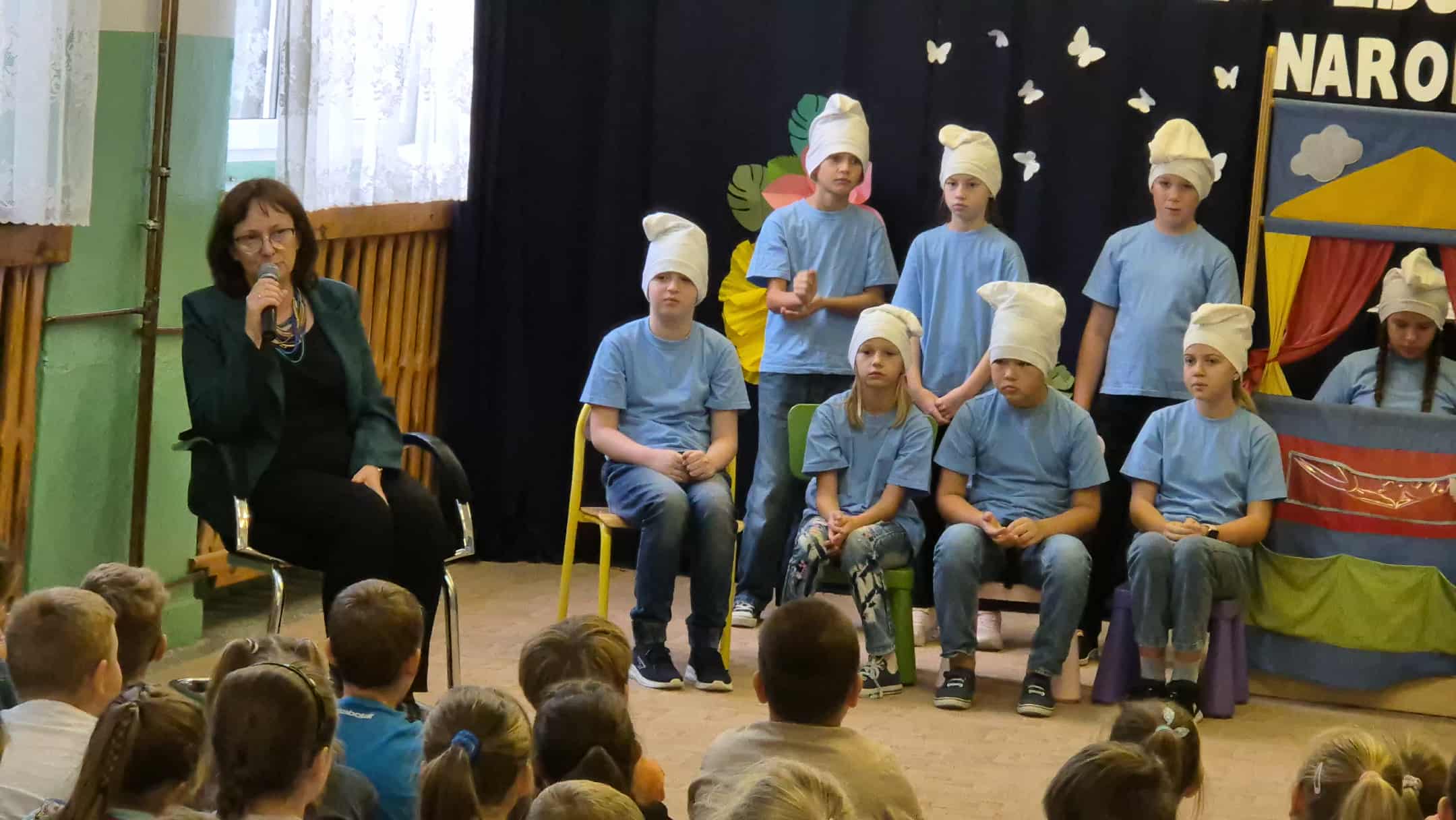 Na początek Smerfy z klasy 3b przeprowadziły wywiad z panią dyrektor. Pytania dotyczyły zawodu nauczyciela. Następnie członkowie samorządu złożyli życzenia i wręczyli okolicznościowe kartki wszystkim pracownikom szkoły.