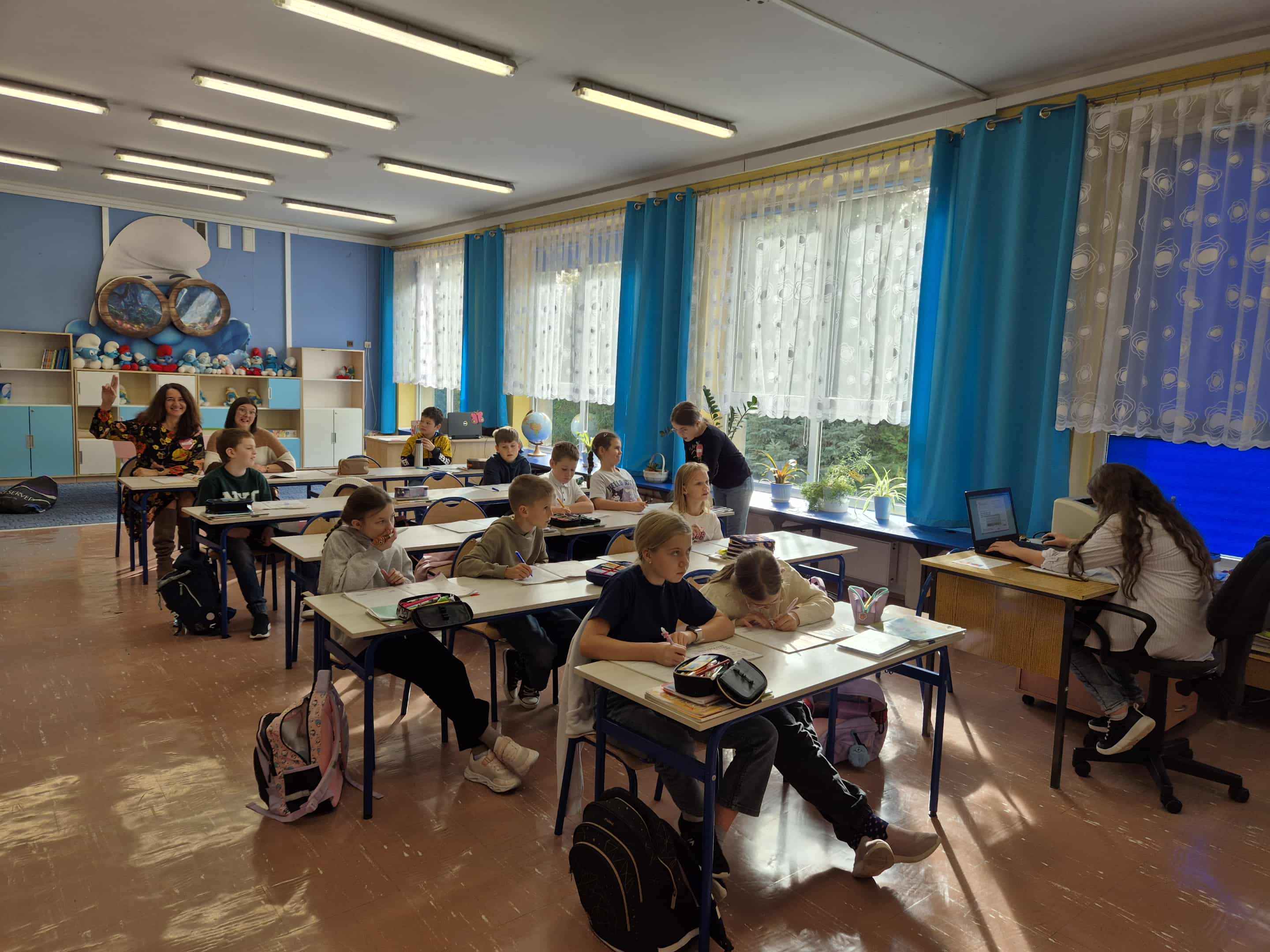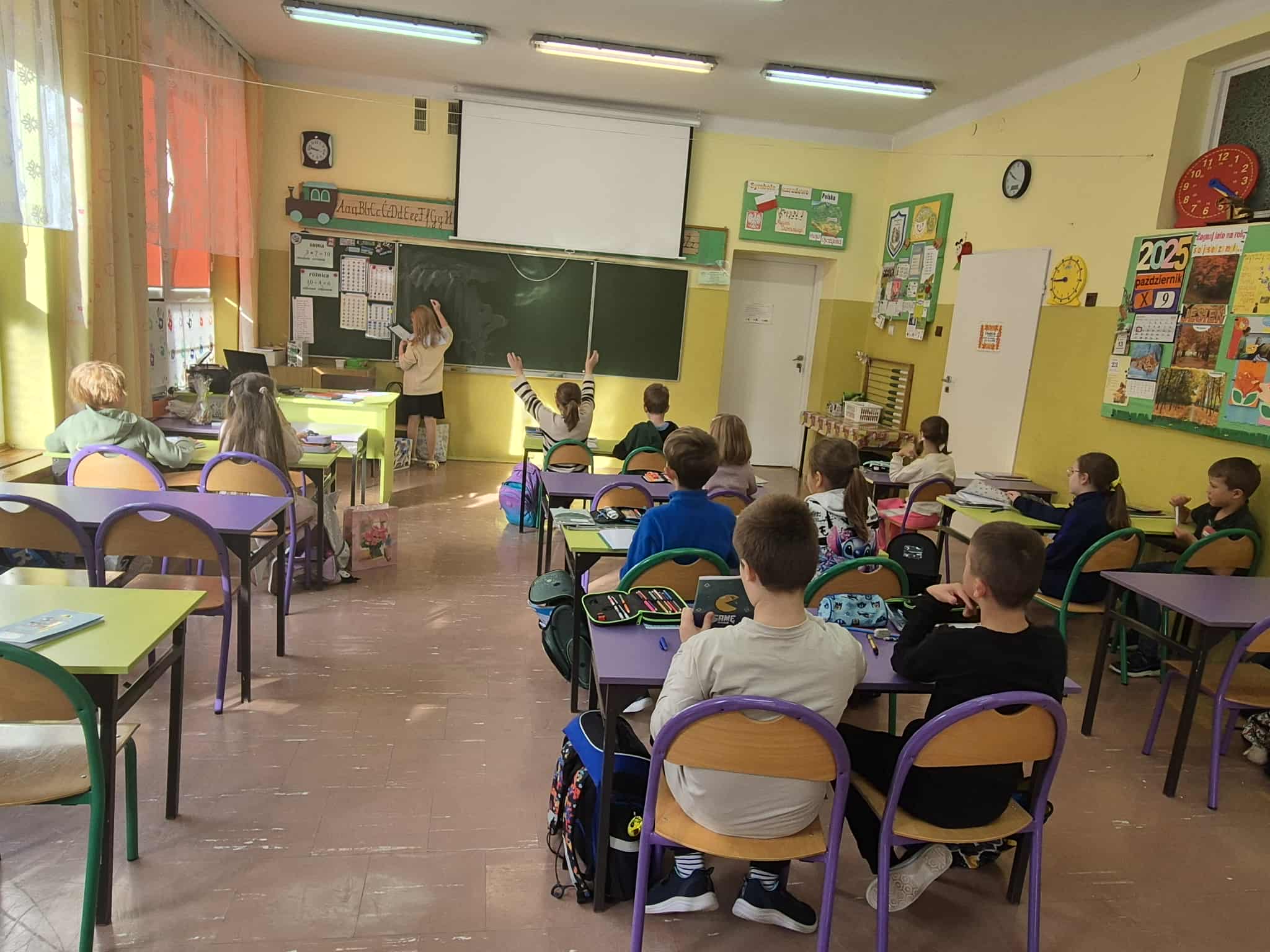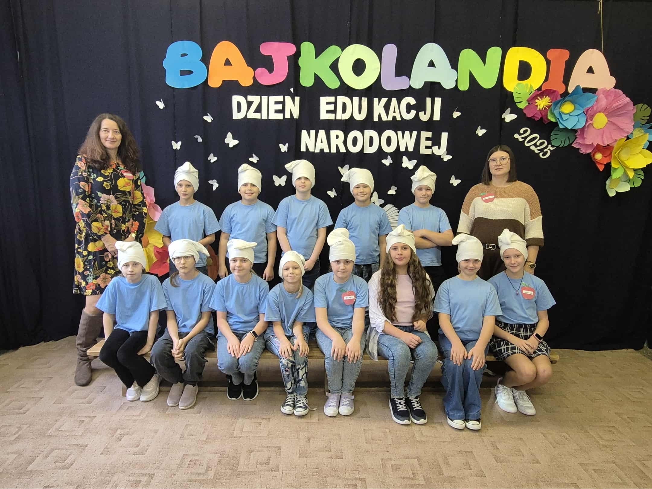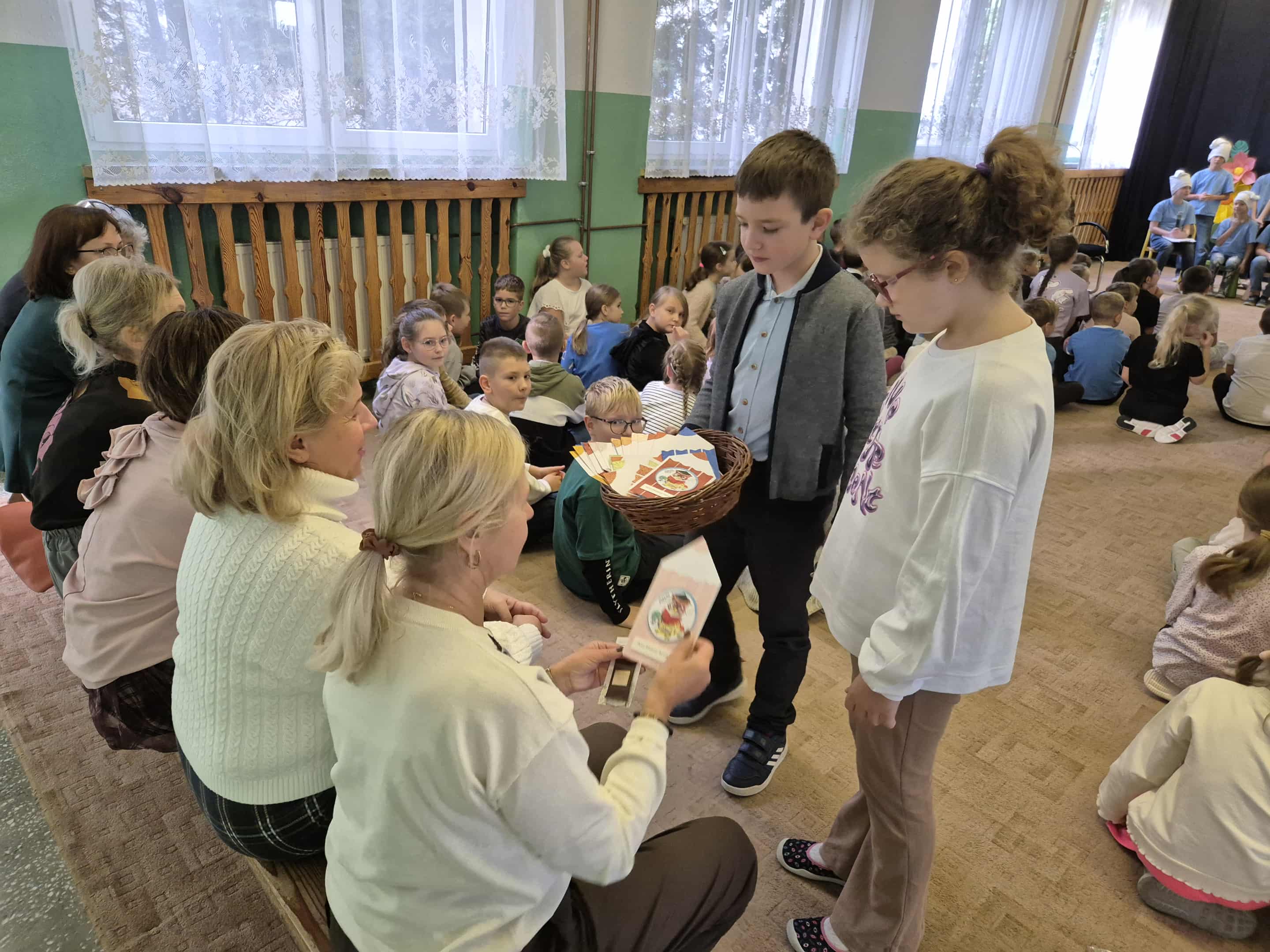 Na początek Smerfy z klasy 3b przeprowadziły wywiad z panią dyrektor. Pytania dotyczyły zawodu nauczyciela. Następnie członkowie samorządu złożyli życzenia i wręczyli okolicznościowe kartki wszystkim pracownikom szkoły.