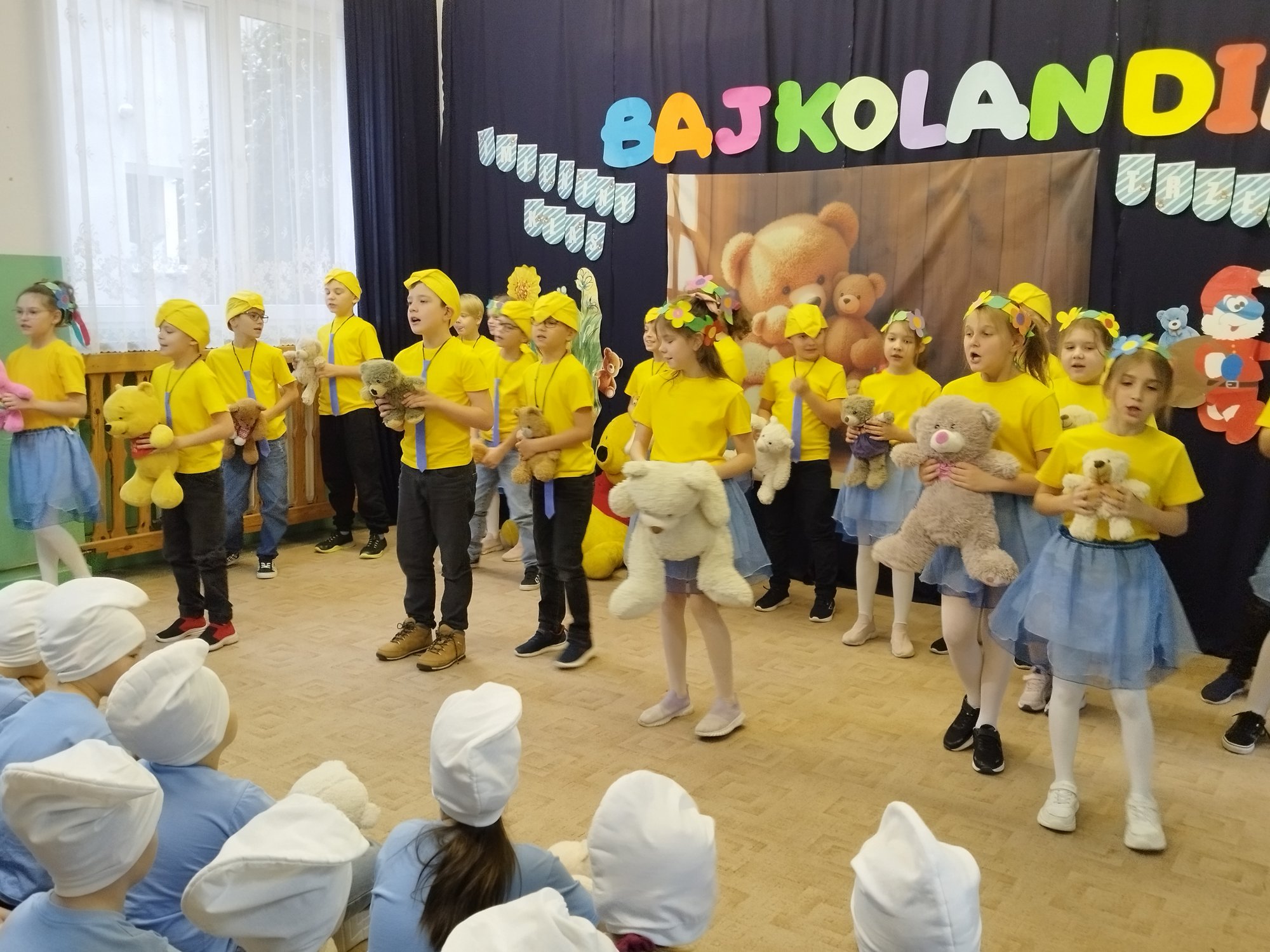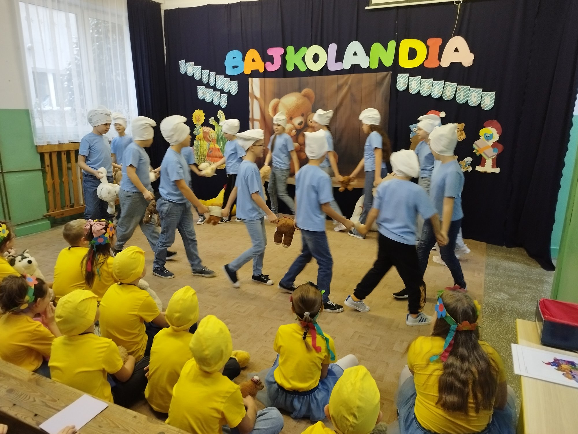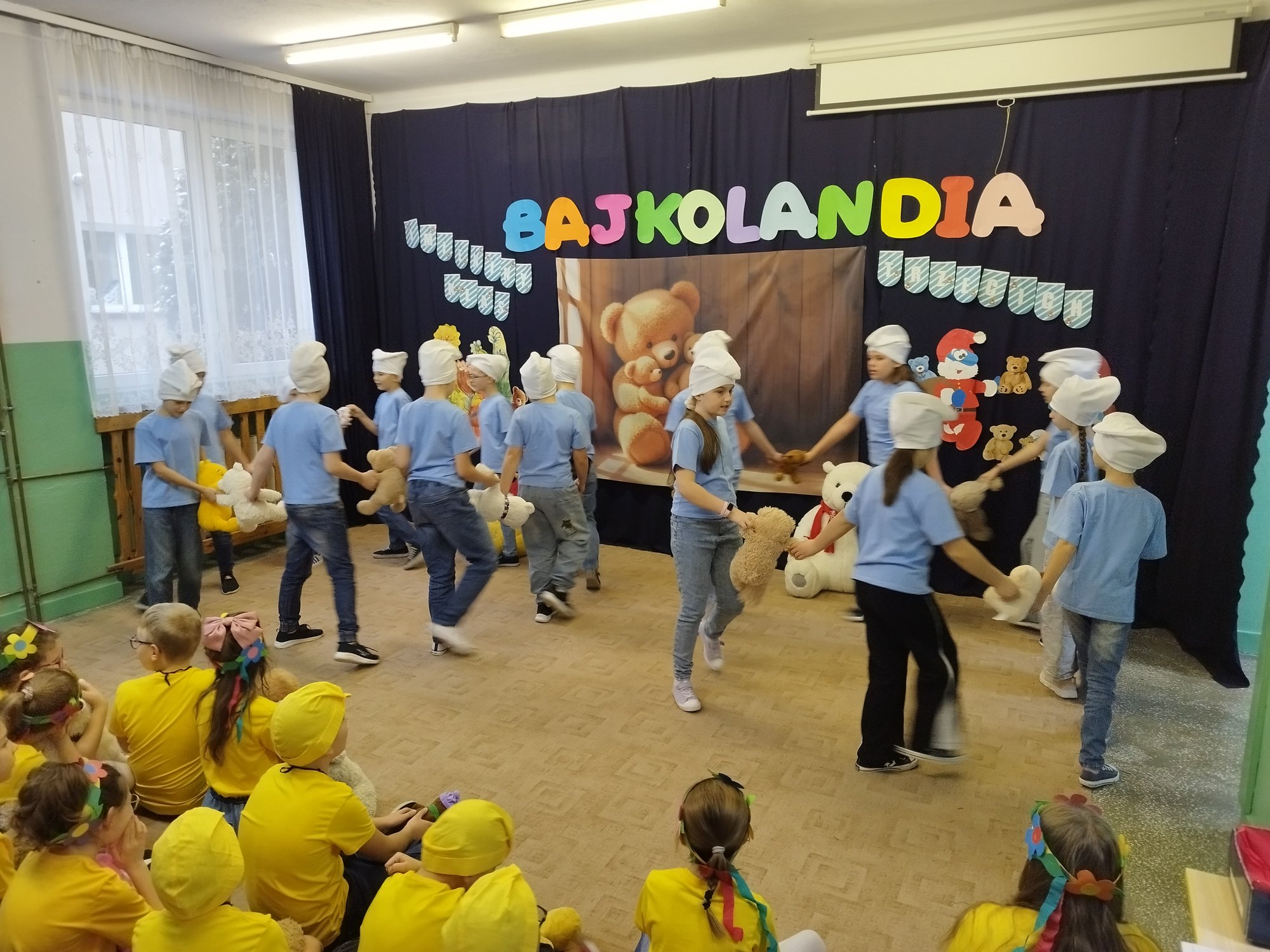 Mottem przewodnim święta był zbliżający się Dzień Misia. Calineczki i Smerfy zaprezentowały misiowe piosenki i tańce oraz zagadki dla młodszych Bajkoludków. Okazało się, że dwie zgadywanki były dość trudne. Na szczęście panie nauczycielki też kiedyś czytały i oglądały bajki z misiami w roli głównej. Nagrody za rozwiązanie zagadek były również "misiowe". Zaproszeni goście złożyli życzenia, wręczyli solenizantom laurki i odśpiewali "Sto lat!".