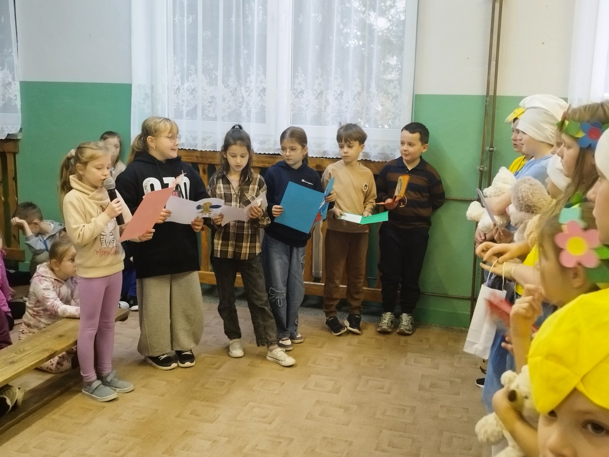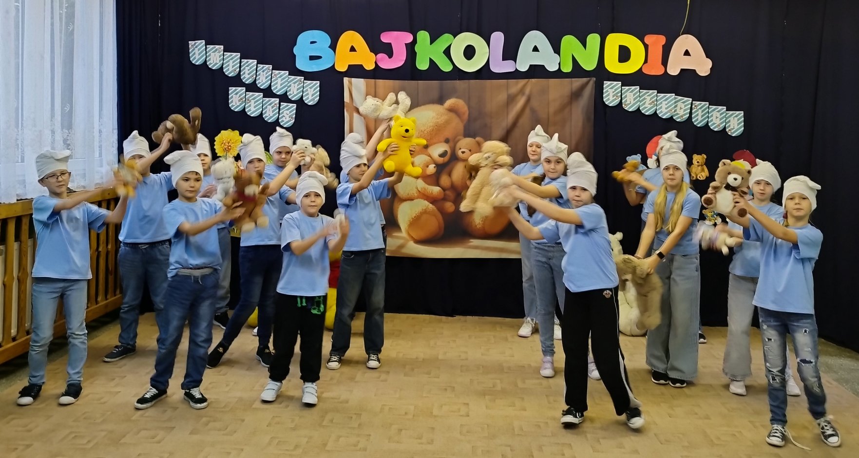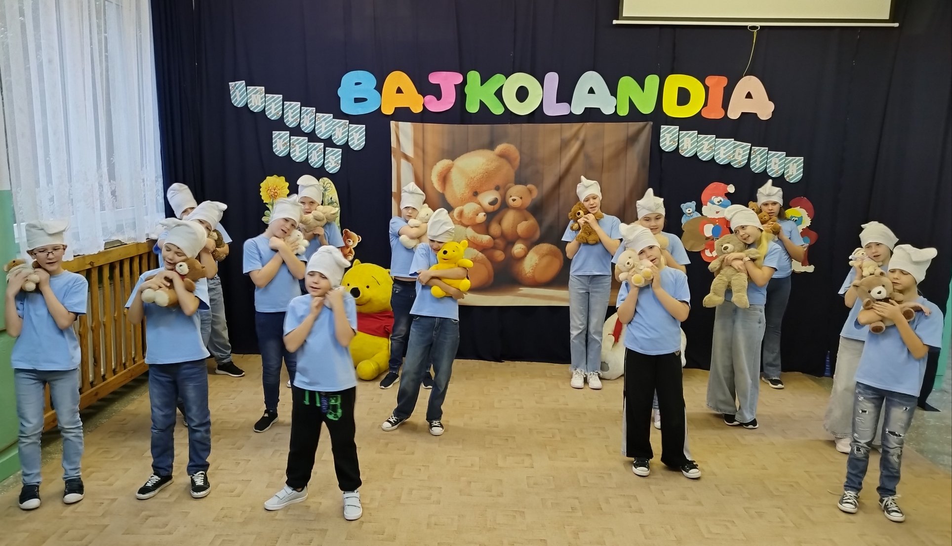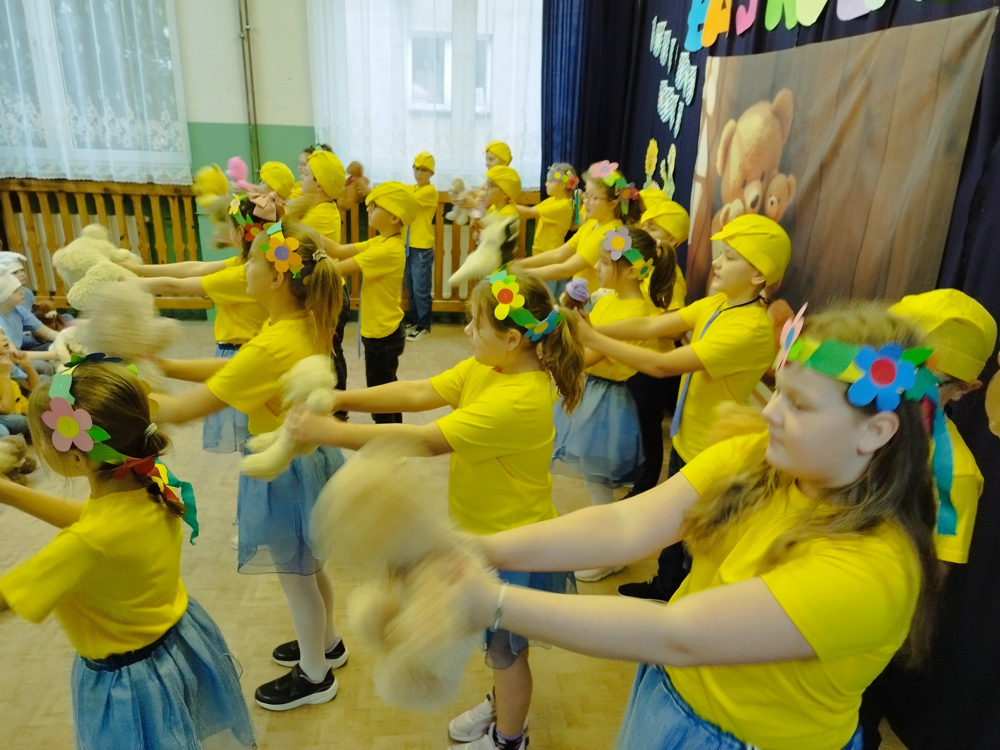 Mottem przewodnim święta był zbliżający się Dzień Misia. Calineczki i Smerfy zaprezentowały misiowe piosenki i tańce oraz zagadki dla młodszych Bajkoludków. Okazało się, że dwie zgadywanki były dość trudne. Na szczęście panie nauczycielki też kiedyś czytały i oglądały bajki z misiami w roli głównej. Nagrody za rozwiązanie zagadek były również "misiowe". Zaproszeni goście złożyli życzenia, wręczyli solenizantom laurki i odśpiewali "Sto lat!".