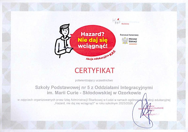 W czwartek 27 listopada 2025 r. uczniowie klas 7 i 8 naszej szkoły uczestniczyli w wyjątkowym spotkaniu edukacyjnym prowadzonym przez przedstawicieli Izby Administracji Skarbowej w ramach projektu edukacyjnego Krajowej Administracji Skarbowej (KAS). Zajęcia dotyczyły niezwykle ważnego i aktualnego tematu – zagrożeń wynikających z hazardu oraz innych uzależnień behawioralnych, takich jak: nadmierne korzystanie z internetu, gier komputerowych czy zakupów online.