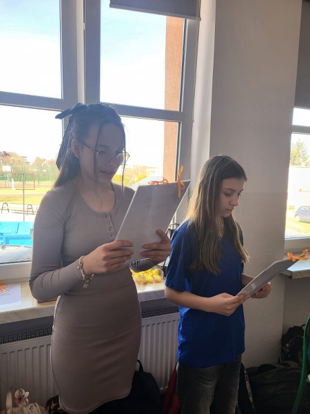 W koszyku pojawił się zajączek wielkanocny, który przyniósł słodkie upominki dla uczniów. Na zakończenie dzieci zabrały do domów wcześniej przygotowane pisanki, aby złożyć swoim rodzinom świąteczne życzenia