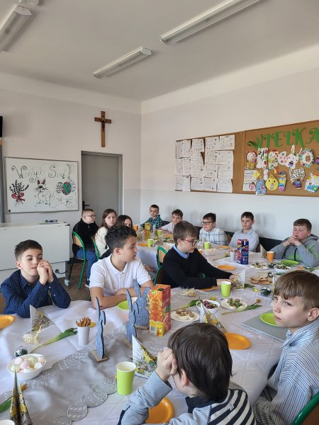 Śniadanie wielkanocne w klasie 5a odbyło się w uroczystej atmosferze. Uczniowie wraz z wychowawcą oraz Panią Iwonką przygotowali klasę i wspólnie zasiedli do stołu z zaproszonymi gośćmi: Panią Dyrektor, Panią Wicedyrektor oraz Panią Elżbietą Paciorek. Podczas spotkania odczytano informacje o tradycjach wielkanocnych, a także nie zabrakło symbolicznego lania wodą.